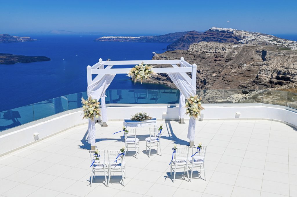 As we exchanged vows, the caldera stretched out behind us. It felt like standing on the edge of the world, in the best possible way. A white pergola draped in roses softened the blue of the sky and sea, with the distant glimmer of white buildings adding to the scene.